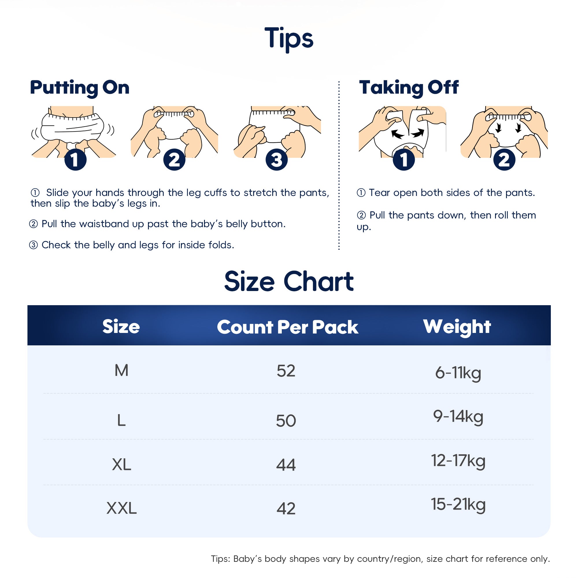 | Age(Months) | Baby Weight (KG) | Waist (cm) | Size | Daily Usage (Pcs) |