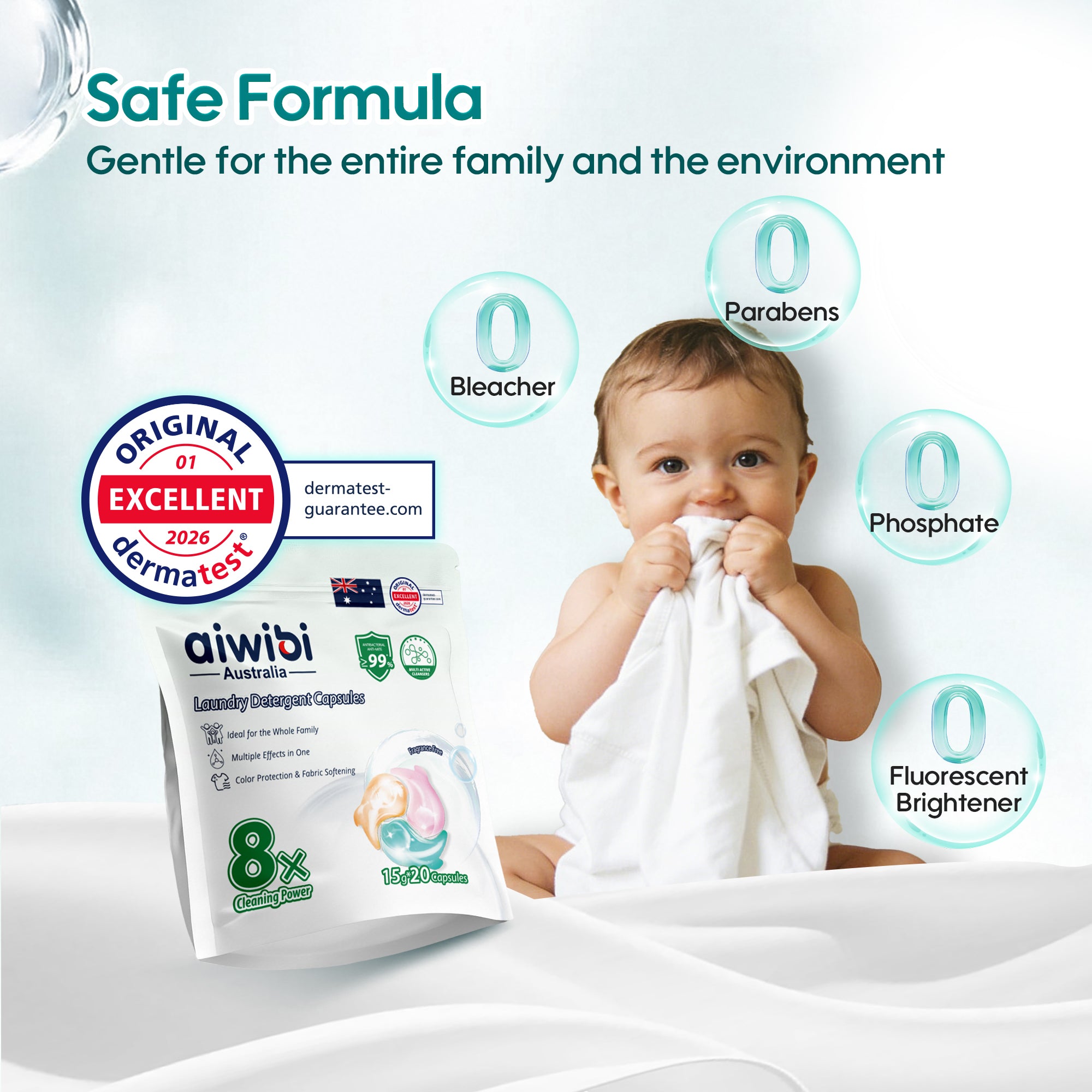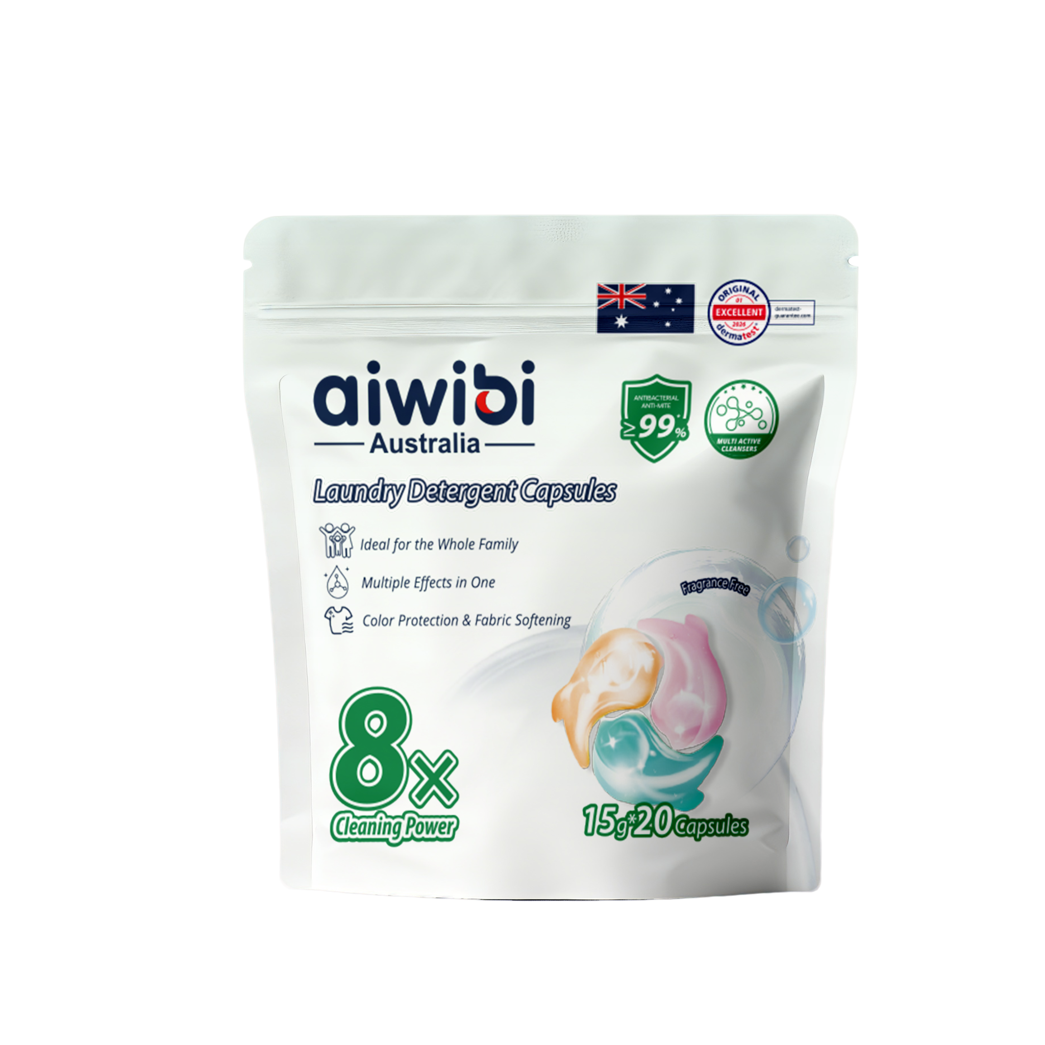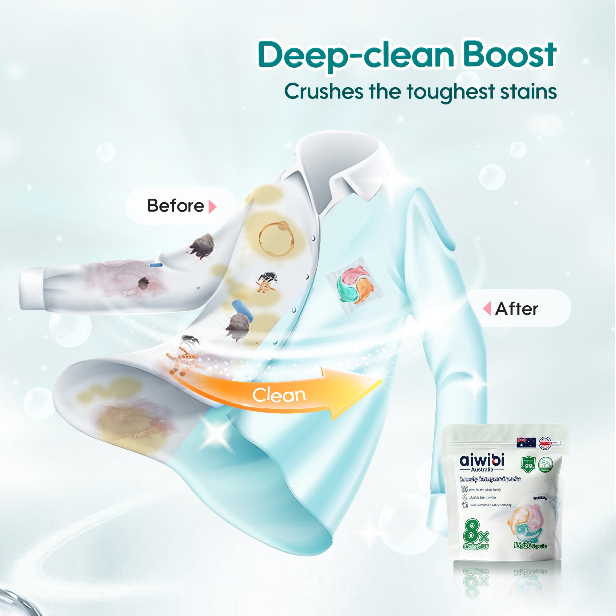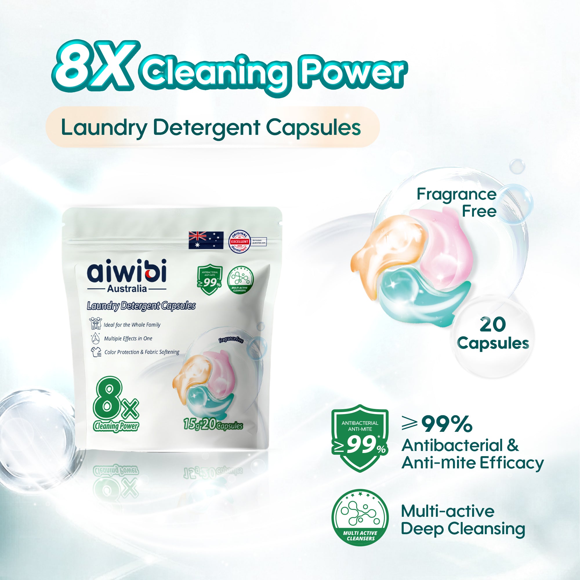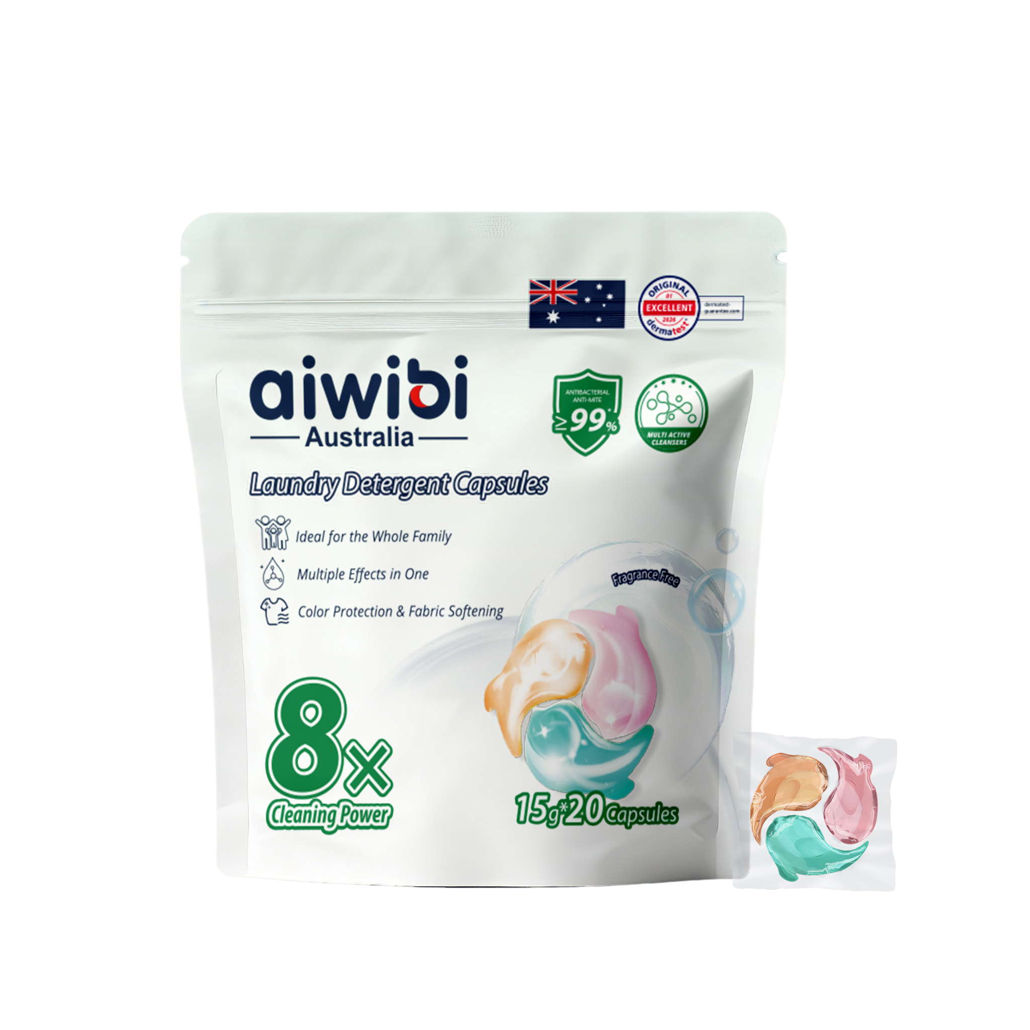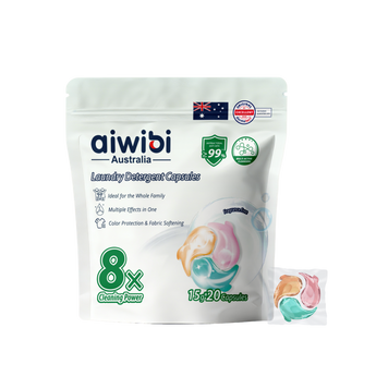 Aiwibi Laundry Detergent Capsules feature an 8-in-1 multi-active formula in one single capsule. They effectively remove tough stains, provide ≥99% antibacterial and anti-mite protection, while brightening clothes and protecting colors. The skin-friendly, low-suds formula leaves laundry fresh, soft and residue-free.