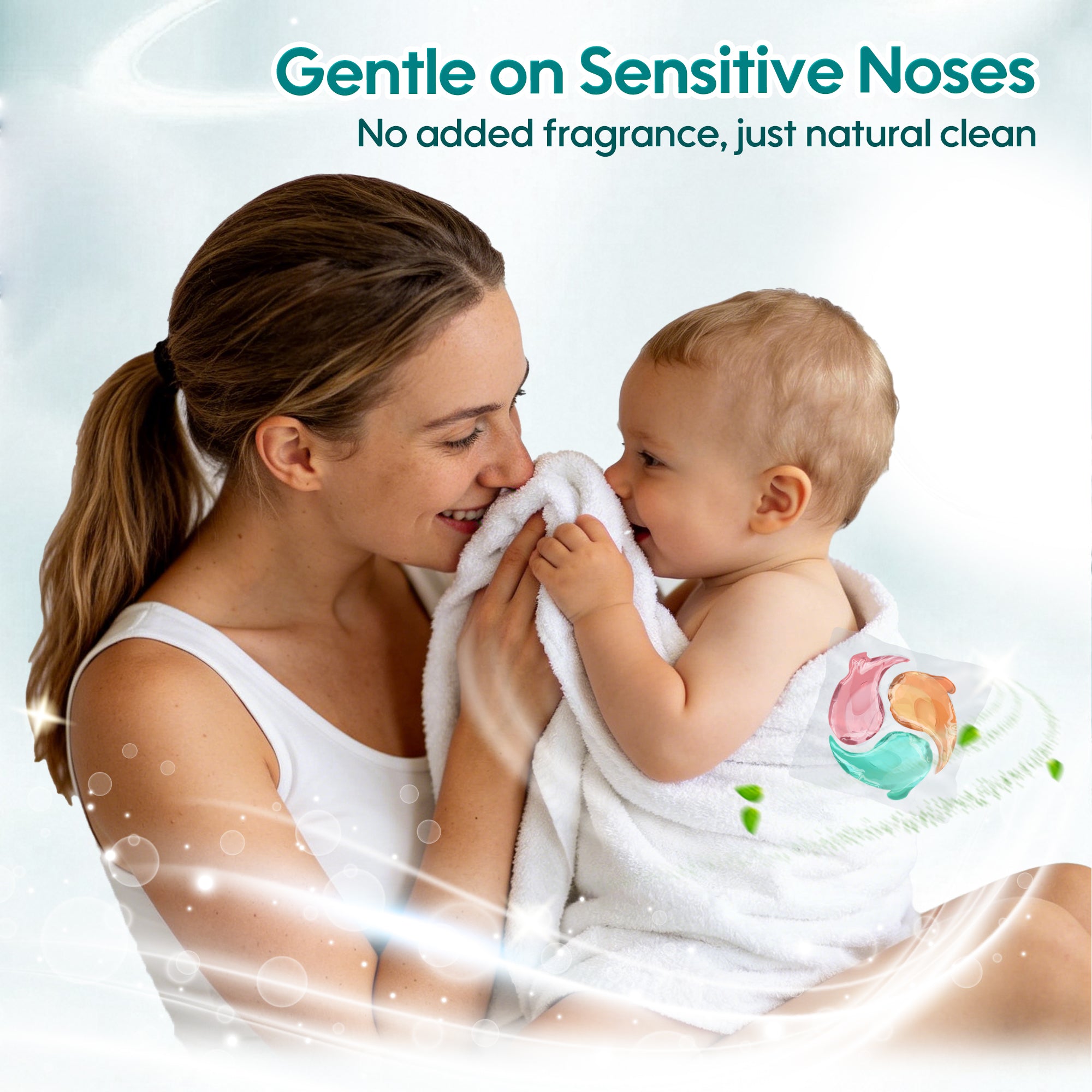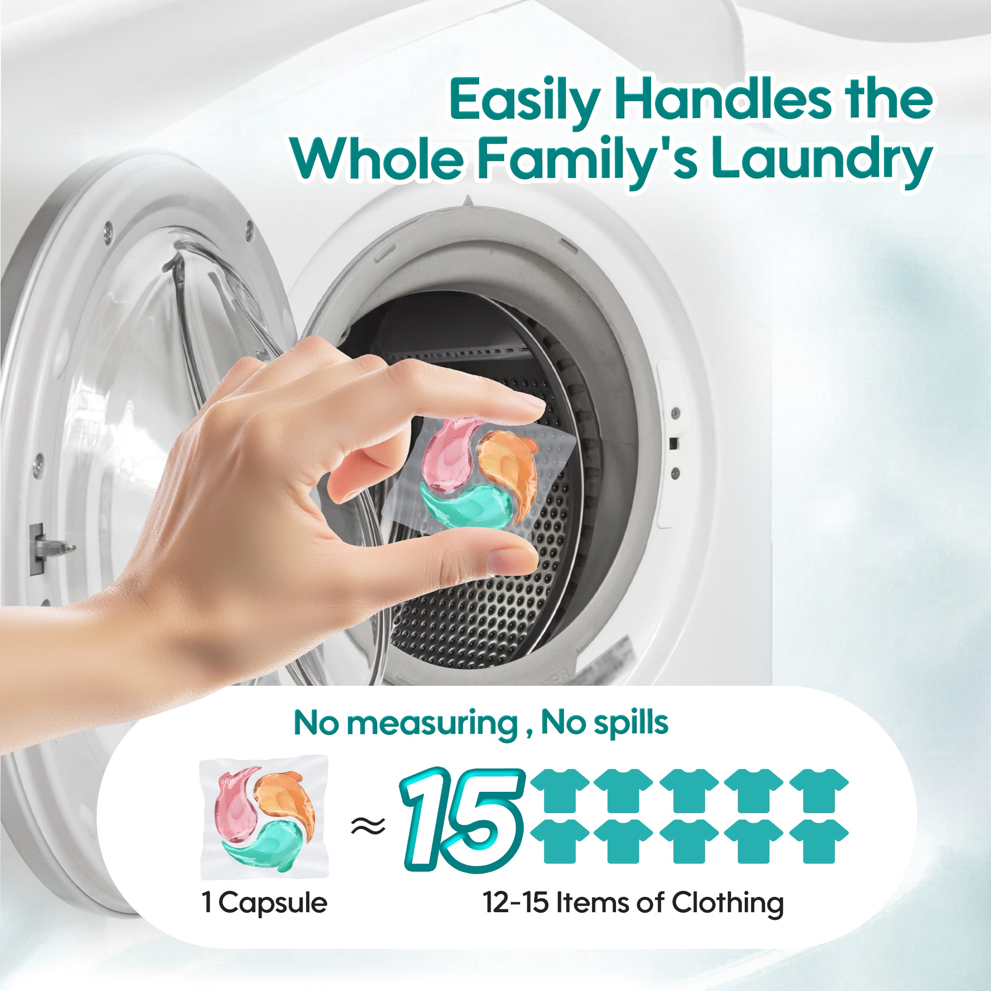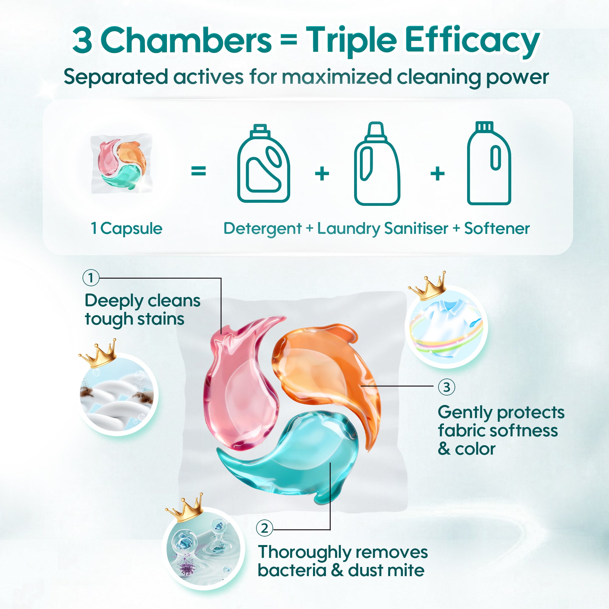 One capsule combines detergent + sanitizer + softener for total laundry care.