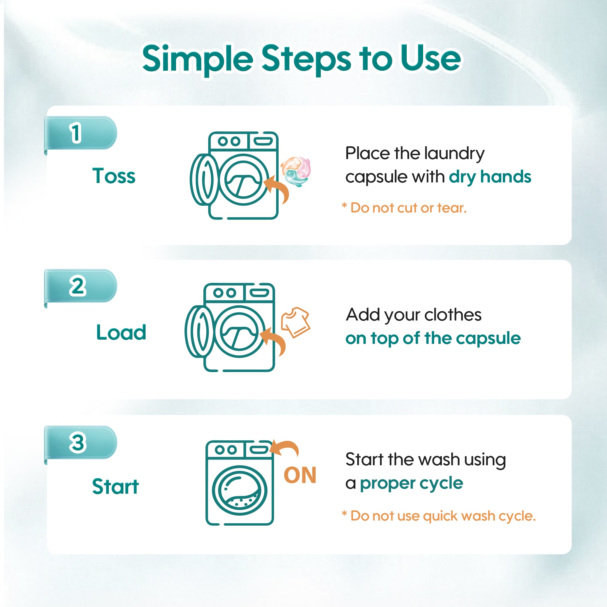 Place the capsule directly into the washing machine drum with dry hands, add clothes on top, and start a normal wash cycle.