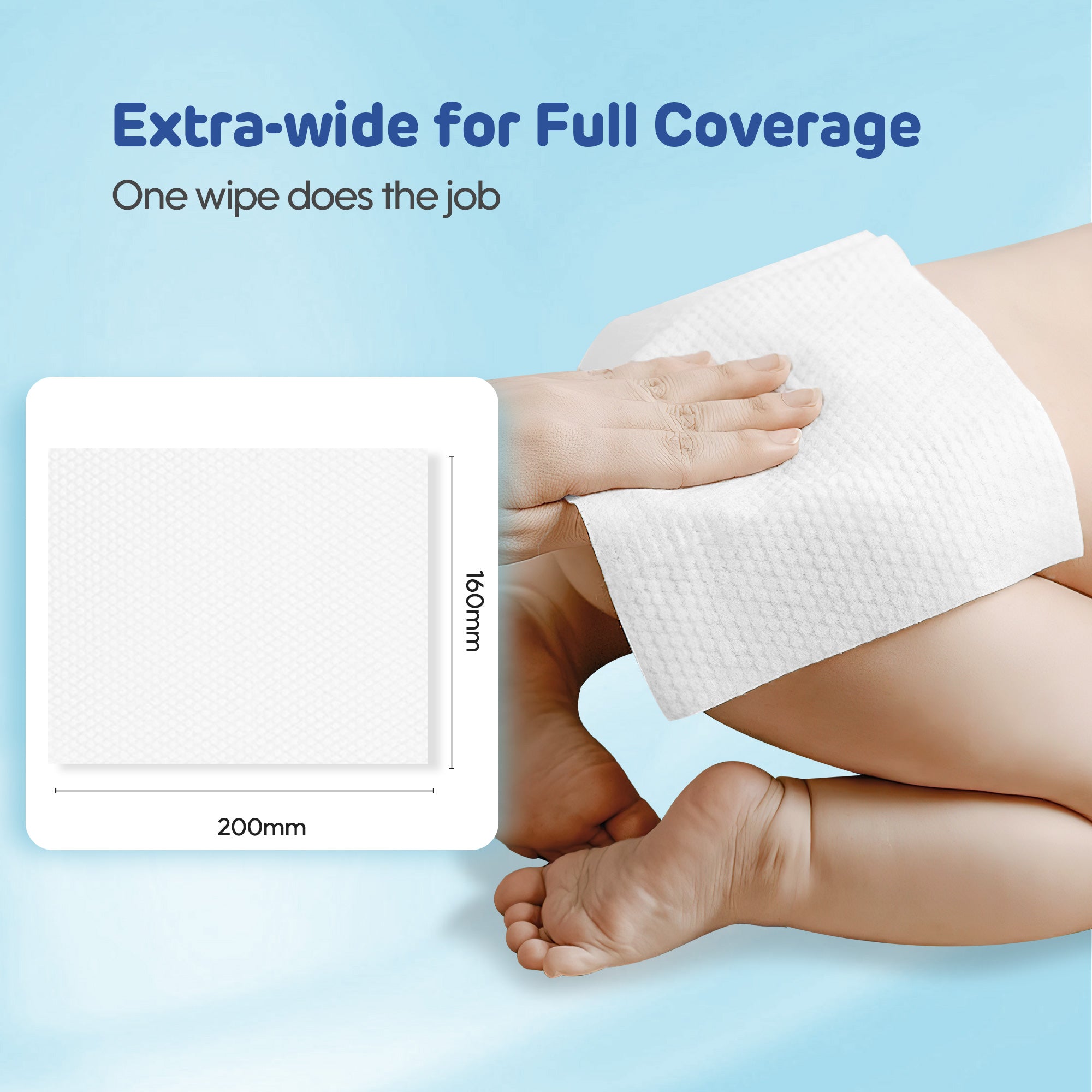 Crafted with 80gsm premium material for unbeatable strength and softness, Aiwibi Premium Wet Wipes offer a luxurious, thick feel for superior protection. Made with 99.91% ultra-high EDI pure water and infused with soothing aloe vera extract, these wipes gently cleanse and hydrate, perfect for sensitive skin. The wipes are made from natural plant fibers, ensuring a soft touch, while the dual-texture design provides both deep cleaning and gentle care. Free from fragrance, alcohol, dyes, and harsh chemicals, each wipe dispenses one at a time to minimize waste and provide efficient cleaning.