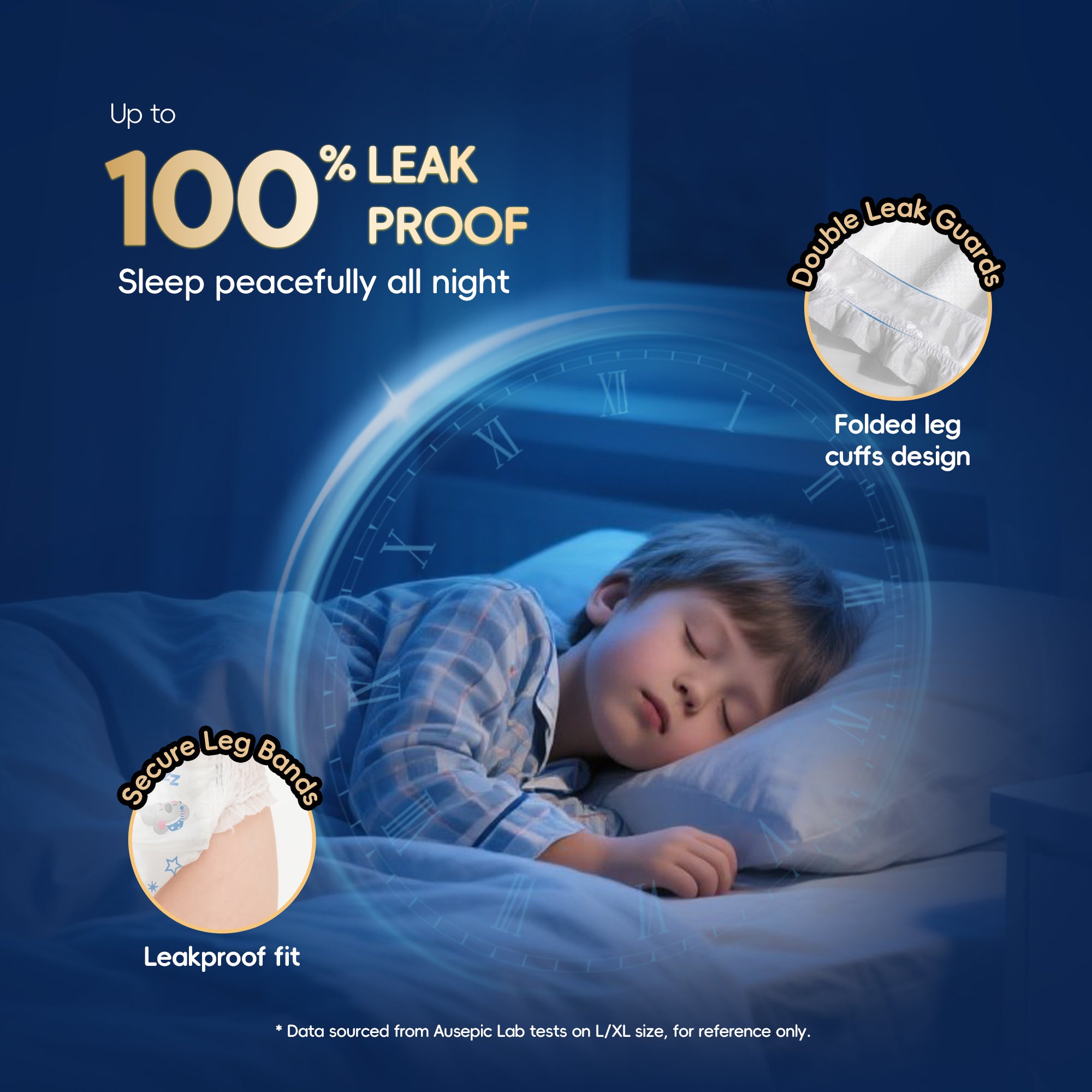 Double Leak Guards with Enhanced Protection. The 45-50mm tall leg cuffs use double-layeredwater-repellent non-woven fabric to lock in moistureeffectively.